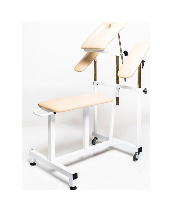 Скамья поставляется в собранном виде. Каркас сделан из стальной профильной трубы с порошковым полимерным покрытием, устойчивым к ударам, сколам и обработке дезинфицирующими растворами. Опоры – регулируемые. Мягкие элементы выполнены из фанеры, поролона, покрыты искусственной кожей SKADEN (Польша) устойчивой к истиранию, химическим дезинфектантам и УФ-излучению. Технология обтяжки - без швов, облегчающая процесс чистки и санобработки. Цвет обивки – по желанию заказчика. Регулировки: Высота головной секции и упоров для рук – механическая, бесступенчатая, фиксация – винт Барашек. Головная секция – по углу наклона от 10°до 90° - механическая, бесступенчатая, фиксация – винт Барашек. Упоры для рук - по углу наклона 340º - механическая, бесступенчатая, фиксация – ручка-фиксатор. Скамья оснащена колесами с шинами из литой резины для легкого перемещения.