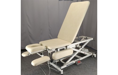 Угол наклона средней части регулируется ступенчато, а лицевая секция двигается плавно при помощи газового амортизатора. Столы могут быть изготовлены с разной шириной: 60, 65, 70, 75, 80 и 85 см. В качестве управляющего элемента используется ножная педаль. Максимальное время подъема ложа из базового положения - всего 14 секунд. Стол вместителен: он составляет 200 сантиметров в длину. Усиленная X- образная рама обеспечивает колоссальную грузоподъемность - до 350 килограмм! Конструкция предусматривает два фронтальных и два боковых подлокотника. Также в комплекте идет удобный полотенцедержатель.